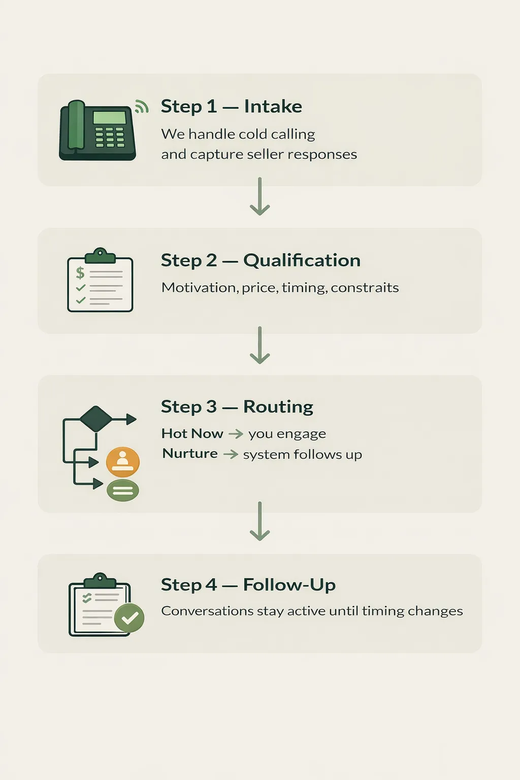 Sellers are qualified live for motivation, price context, and timing—so you’re not chasing conversations that go nowhere.